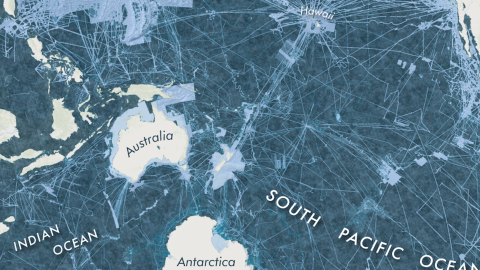 The distribution of light and dark tells us something about the progress of submarine mapping. Light-blue lines crossing the dark-blue expanse are busy, well-charted shipping lanes. Larger light-blue patches correspond to the waters of countries where mapping their bit of ocean is a priority.