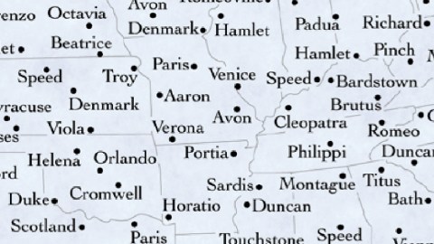 A ‘book tour’ four hundred years after the death of the author, that’s fantastic measure of his work’s lasting impact. The First Folio travel schedule around America’s 50 states included the capitals and larger cities of each state. But this itinerary would be way cooler: if the books visited the locations across America that bear the name of characters and places mentioned in Shakespeare.