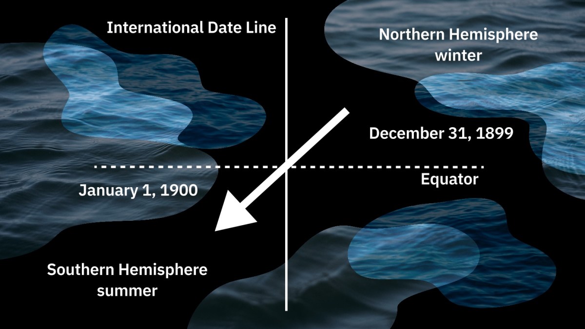 This had some positively mind-boggling consequences. The forward part of the ship was in the southern hemisphere, where it was summer, and already January 1, 1900. The aft part of the ship was in the northern hemisphere, where it was winter, and still December 31, 1899.
