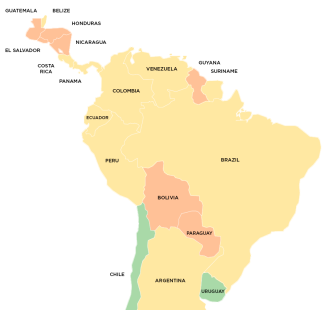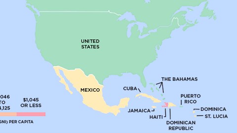 Most of North America is green; that’s because the U.S. and Canada fall into the high-income category. The Bahamas adds the only other dash of green to the map. The only country on the other side of the scale is Haiti, in red: the poorest country in the Western Hemisphere. All the others fall into the yellow category – upper middle income.