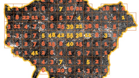 The London Sound Survey contains several maps. The “General Sound Map” divides Greater London in grid squares 2.5 miles (4 km) across. The squares are not numbered: Those figures denote the amount of sound clips contained in each of the squares. Some of the outer ones are still virgin territory. Those in the centre have the highest number of soundings.