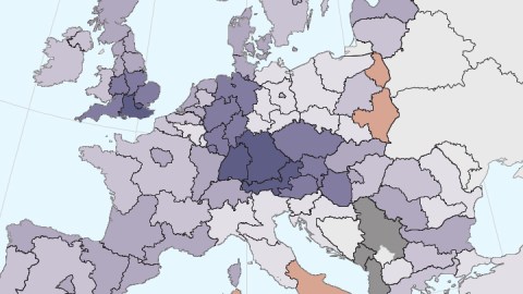 The darkest blue is reserved for countries and regions where men earn at least 25% more than their female counterparts: Estonia, London and South East England, and a transnational area in central Europe consisting of Bavaria and Baden-Württemberg in Germany, and West Austria (1). There is a clear internal gender pay gap in Germany, with the near-equality in the former East contrasting with the aforementioned areas of high inequality, which decreases towards the north.