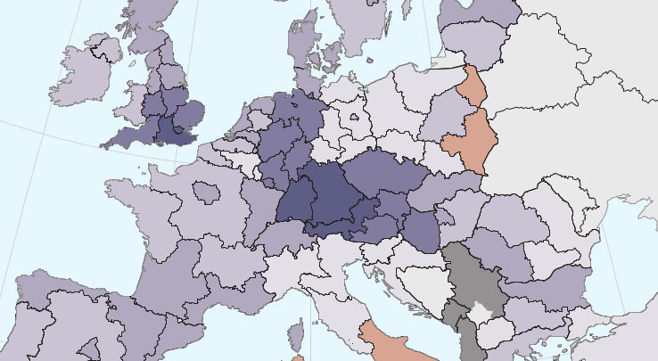 The darkest blue is reserved for countries and regions where men earn at least 25% more than their female counterparts: Estonia, London and South East England, and a transnational area in central Europe consisting of Bavaria and Baden-Württemberg in Germany, and West Austria (1). There is a clear internal gender pay gap in Germany, with the near-equality in the former East contrasting with the aforementioned areas of high inequality, which decreases towards the north.