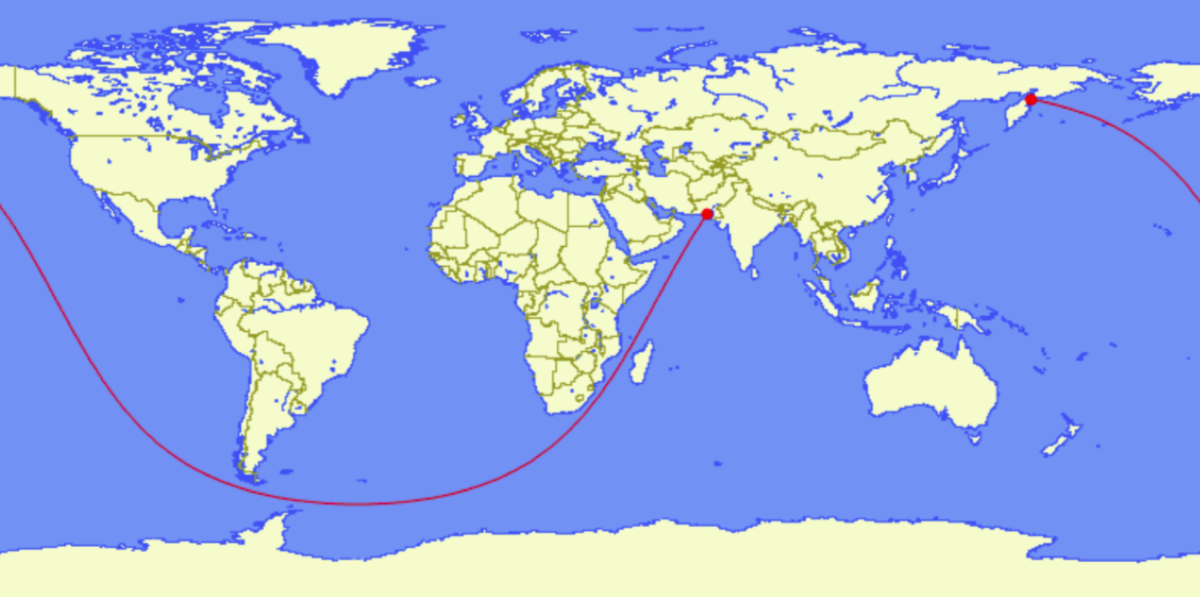 They were prompted by a map that had raised a lot of discussion since its first publication on Reddit in 2012. Posted by user kepleronlyknows, it purports to show the longest possible straight-line sailing route in the world: from Pakistan to Kamchatka, threading the needle twice – through the Mozambique Strait separating Madagascar from the African mainland, and via the Drake Passage between South America and Antarctica.