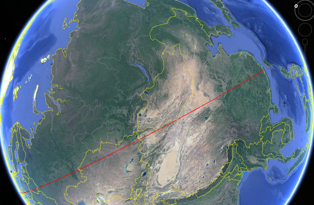 Because the globe is round and this map is not, the world’s longest straight line over land – like all others long enough – looks like a bendy one on this image. For anyone walking the line, though, it would have been straight as a ruler, and, at the end of that trip, close to 20,000 miles long.