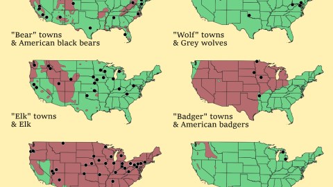 They compare the geographic spread of cities and towns (1) in America named after native animals and the current geographic distribution of those species. As you may have expected, most indicate a huge reduction in the range of said animals.