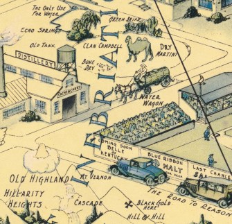 The skull-shaped island (3) is named the State of Inebriation, surrounded by bodies of water named Whiskey Strait, Gulp Stream and Rum Row. Off the island are a sand bar (with bar flies), several whis-keys, etc. The island itself is dotted with all kinds of objects you’d expect on a genuine map: buildings, roads, lakes, mountains – each of which refers to some aspect of drinking.