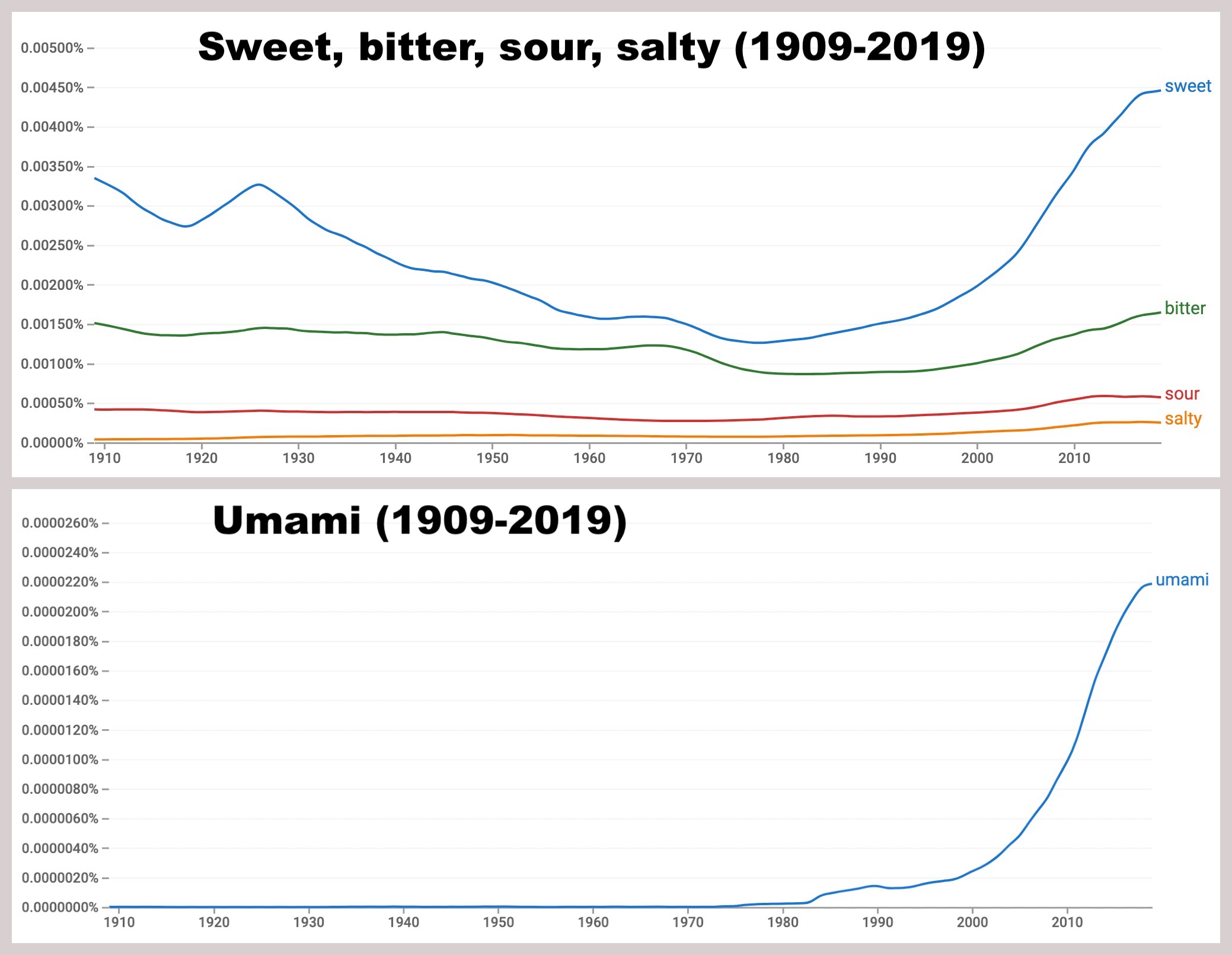 References in English language sources to the four traditional tastes (top) and to umami (bottom) for the period 1909-2019. Sweetness had been on a decline since the 1920s but has reached new heights after 2000. Bitter is a distant second. Salty remains the least quoted taste. (Of course, these four words have meanings besides culinary ones.) References to umami only take off after 1980 and soar after 2000. Note that both graphs have a different scale. (Credit: Google Ngrams / Ruland Kolen)