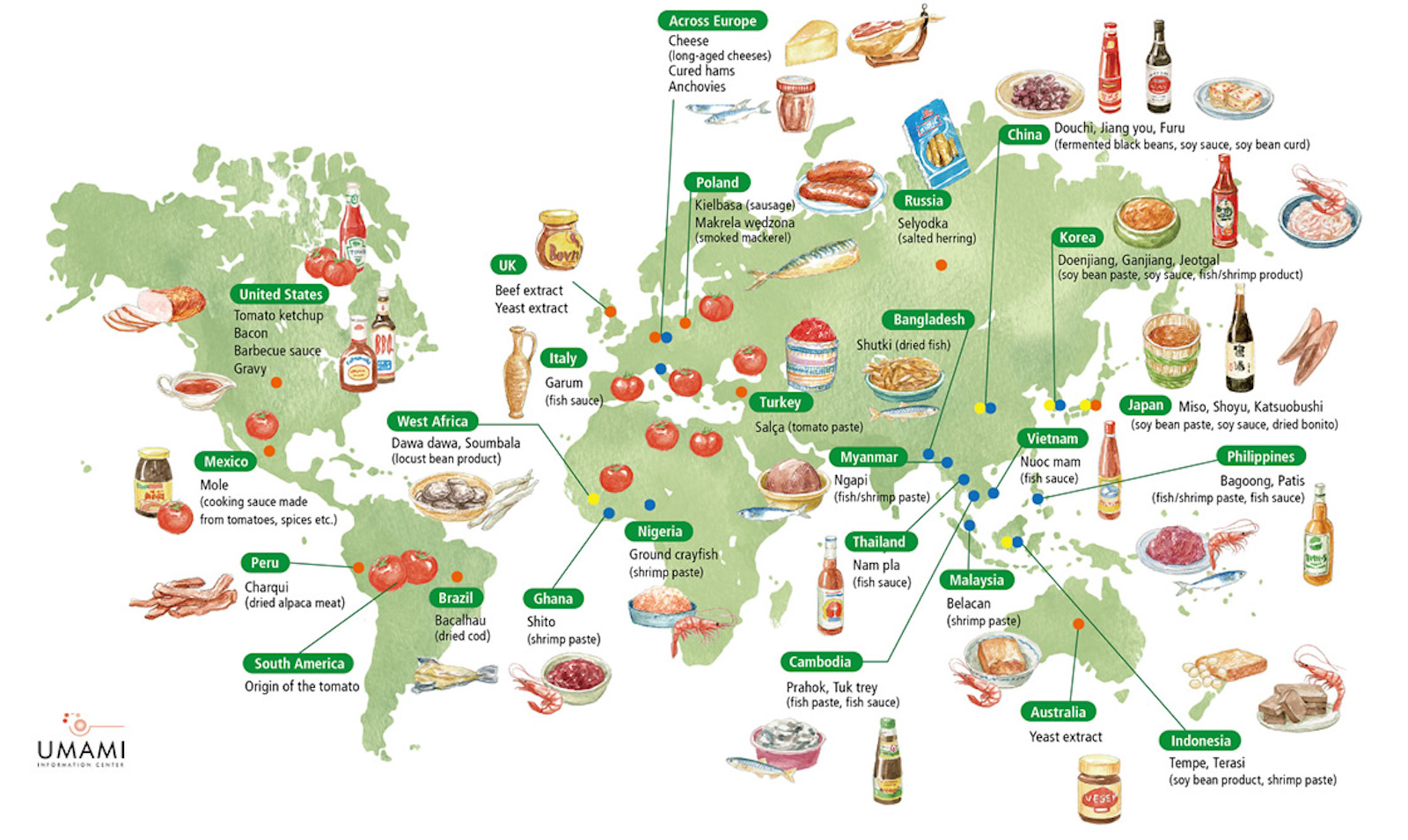 Click here to zoom in on the map. Umami, the unknown “fifth flavor”, is enjoyed the world over. (Credit: Umami Information Center)