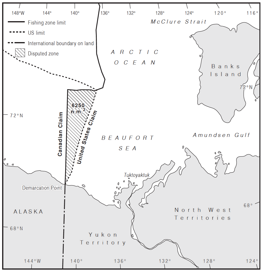 The dispute is about a wedge-shaped area north of where the border between Alaska and the Yukon territory reaches the sea. That land border follows the 141st meridian west, as agreed in the 1825 Treaty of St. Petersburg between Russia and Britain.