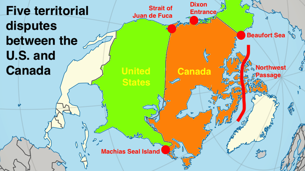 It is often called the longest undefended and peaceful border in the world, and for its 5,525 miles (8,891 km) over land, the U.S.-Canada border is just that. At sea, it is a different story. There are five maritime locations where Canada and the U.S. have very different opinions over who owns what. If ever the friendly relations between both countries turn frosty, it could very well be over one or more of these disputed areas.