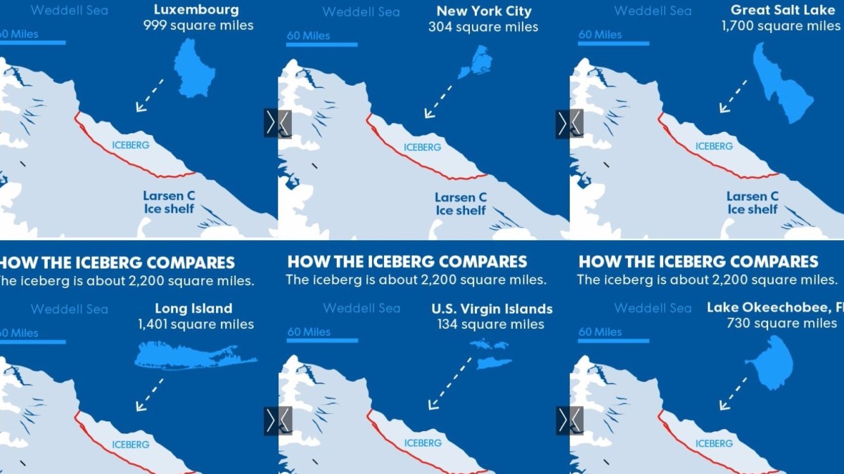 USA Today even produced a slide show, comparing the iceberg to a number of famous, smaller landmarks. Put next to each other, the slides give insight into the relative sizes of Los Angeles (close to seven and a half times Washington DC), the Grand Canyon (roughly twice the size of Luxembourg) and the Great Salt Lake (bigger than Long Island), among others.
