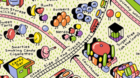 Some maps need to be savored instead of analyzed; digested, not discussed. Like this delicious map of Candy County, by Minneapolis artist and printmaker Faye Passow. It’s crammed with the delightful nomenclature of confectionery (from Lemonheads to Pixy Stix), rich in wordplay (Easter Egg Island, the Candy Bar) and sure to tickle the fancy of anyone with a sweet tooth. It would look great as a poster in the dentist’s waiting room.