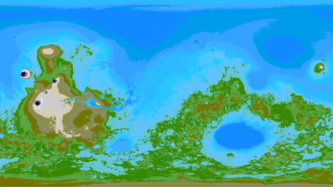 Most of the dry land is connected via the south pole but is articulated in two distinct land masses. Both semi-continents are separated by a wide bay that corresponds to Argyre Planitia.