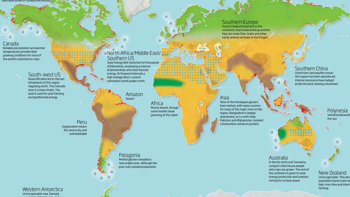 But there is also good news: Western Antarctica is no longer icy and uninhabitable. Smart cities thrive in newly green and pleasant lands. And Northern Canada, Scandinavia and Siberia produce bountiful harvests to feed the hundreds of millions of climate refugees who now call those regions home.