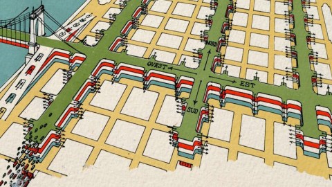 Crosstown Boulevard (1929) – diving under every other avenue, this boulevard provides a speedy connection between the east and west sides of Manhattan. Note the ‘aero-garages’ at the end of airplane runways pasted high up along the city’s straight-line street grid.