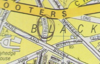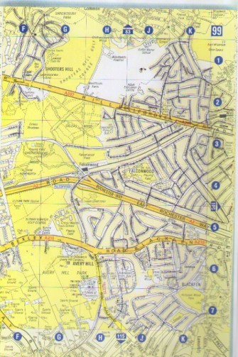 What she found was Whitfield Road. In her A-Z (and my edition too), it’s the continuation of General Wolfe Road on the south side of Shooters Hill Road, connecting it to Hare and Billet Road. But on other maps, and in real life, there’s just the unbroken green of Blackheath Common.