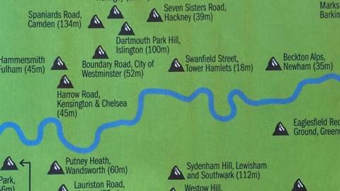 London has 32 boroughs, but the map (and this list) has only 31 tops. That’s because Sydenham Hill, on the border between Southwark and Lewisham, is the highest point in both boroughs. Not mentioned on the map is the highest point in the City of London, which is a separate and independent entity, not part of Greater London as such.