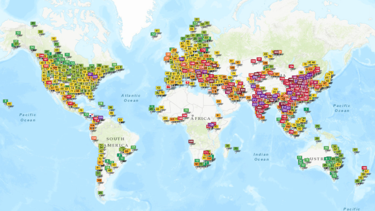 So, how is the air where you are? The World Air Quality Index will show you real-time AQI data from hundreds of sample stations around the globe. Each location is represented by an AQI number and color code. That makes it easy to identify some huge troublespots, like the densely populated and highly urbanized parts of Asia (i.e. large parts of China and India), but also Iran and other parts of the Middle East.