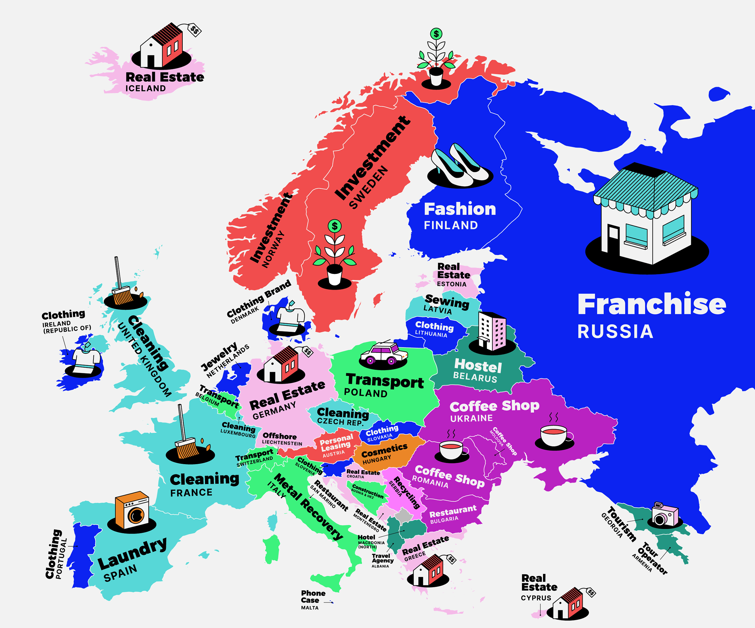 If anything has reliably grown in Europe over the past decades, it’s house prices — hence, the popularity of real estate as the first preference of those aiming to start a business (in Germany, but also Iceland, Estonia, Croatia, Montenegro, Greece, and Cyprus). Clothing and fashion are popular choices across the continent, from Portugal to Finland. Various personal services industries are number one in France, UK, and Czechia (all cleaning), Spain (laundry), and Latvia (sewing).