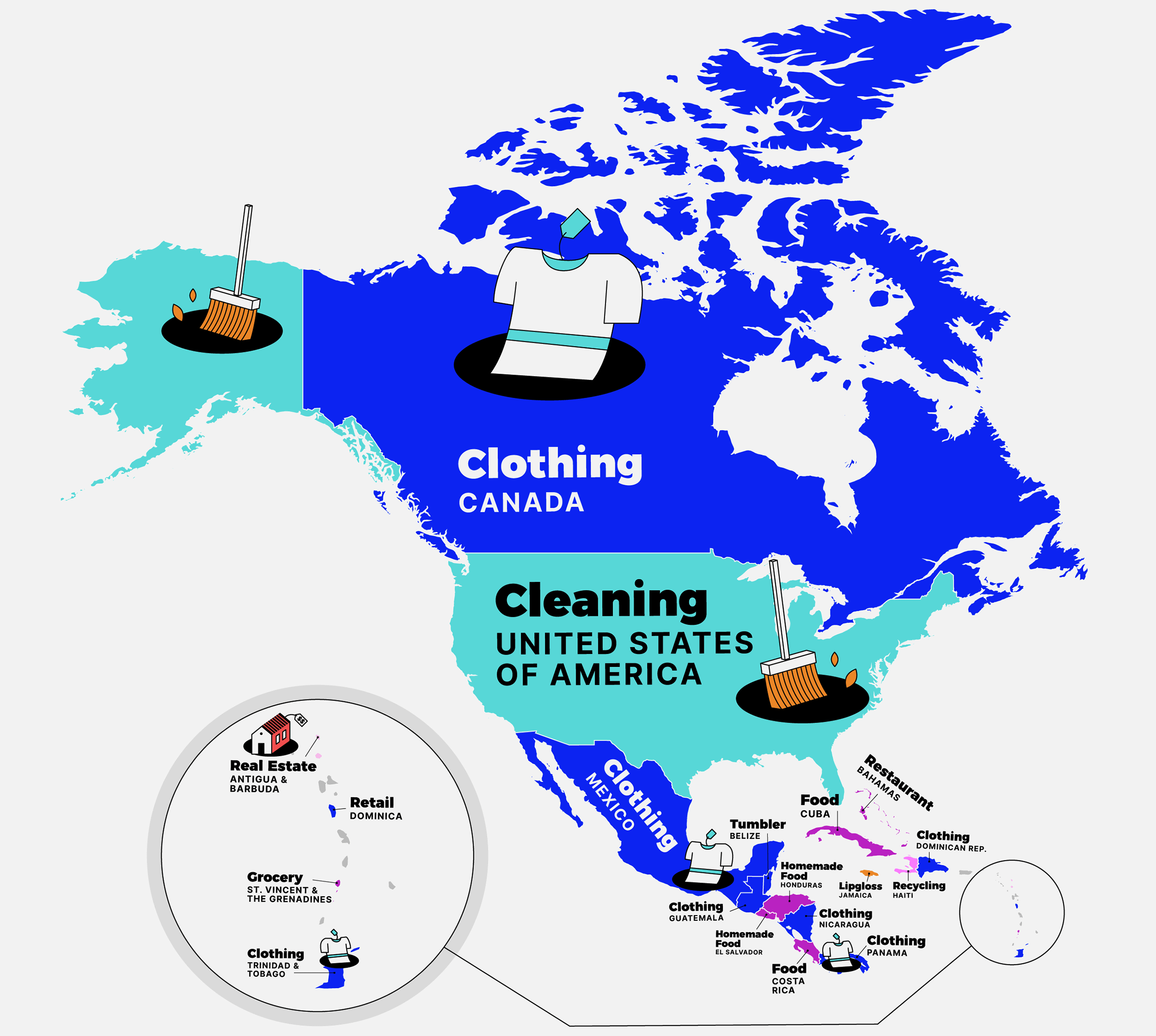 Retail and e-commerce are the most popular queries when starting a business — hence, the popularity of clothing (Canada, Mexico, and elsewhere) and food (Cuba, Costa Rica, and more). In that sense, the U.S. preference for a service industry (cleaning) is atypical. Two even more remarkable outliers are in the Caribbean: Jamaica, where would-be entrepreneurs see lip gloss as the ticket to corporate success, and Haiti, where it’s recycling.