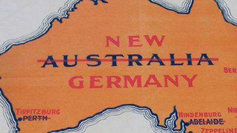 Around the time of the First World War, a geographically more improbable source of invasion anxiety was grafted on this pre-existing paranoia – fear of a Teutonic takeover. This undated poster shows a map of Australia with its name struck through and replaced by New Germany.