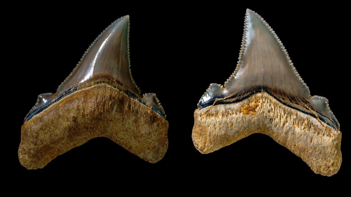 Two views of a fossilized tooth belonging to Carcharocles angustidens, a prehistoric shark that likely measured more than 30 feet long. (Credit: Museums Victoria.)