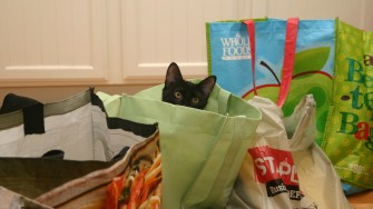 If that fails, hiding’s useful, too, and so your cat sneaks on occasion into your sweater drawer. The universal feline love affair with boxes may also be a safety thing. And, of course, a cat would never hide in a grocery bag.