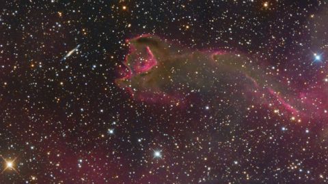 The “claw” of this odd looking “creature” in the above photo is a gas cloud known as a cometary globule. This globule, however, has ruptured. Cometary globules are typically characterized by dusty heads and elongated tails. These features cause cometary globules to have visual similarities to comets, but in reality they are very much different. Globules are frequently the birthplaces of stars, and many show very young stars in their heads. The reason for the rupture in the head of this object is not completely known. The galaxy to the left of the globule is huge, very far in the distance, and only placed near CG4 by chance superposition.