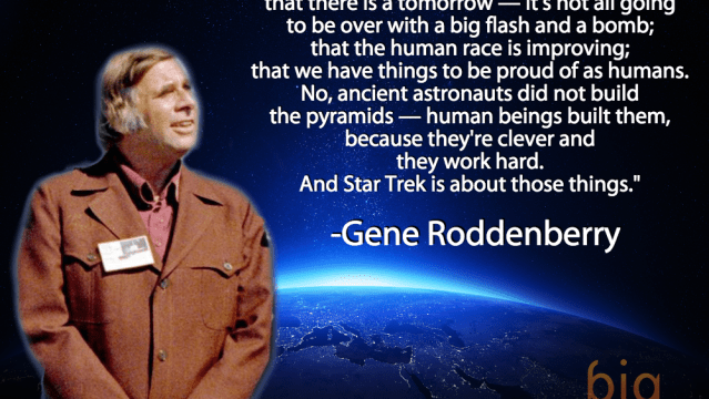 “Star Trek speaks to some basic human needs: that there is a tomorrow — it’s not all going to be over with a big flash and a bomb; that the human race is improving; that we have things to be proud of as humans. No, ancient astronauts did not build the pyramids — human beings built them, because they’re clever and they work hard. And Star Trek is about those things.”