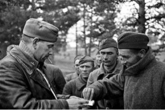 Finnish officer shares cigarettes with Soviet POWs at Aunus. Credit: SA-Kuvat