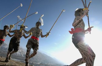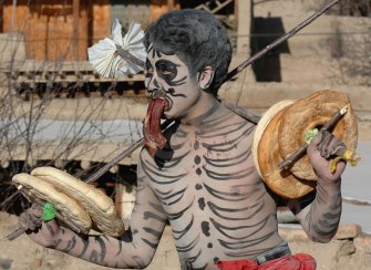 The men apply ashes and draw lines on their bodies, while villagers then put Chinese bread and meat on the sticks of the Wutus. The more food Wutus took, the more luck they were considered to bring, as the villagers think Wutus take away bad luck and evil. In the end of the ceremony, Wutus wash in the river symbolizing getting rid of the evil.
