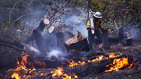 Photo MIDDLETOWN, CA – SEPTEMBER 15: A sawyer climbs a hillside while cutting down trees that burned in the Valley Fire on September 15, 2015 in Middletown, California. The 104-square-mile fire destroyed 585 homes and hundreds of other structures. (Photo by David McNew/Getty Images)