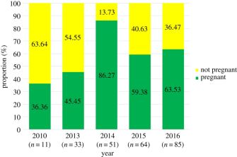Graph: Inter-annual variation in the proportion of assigned pregnant and not pregnant (pregnancy rate) female humpback whales sampled along the Western Antarctic Peninsula based on progesterone concentrations. The overall mean pregnancy rate across all years was 63.5%.