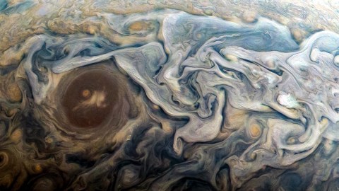 The model that lands Jupiter where it is today, along with its thousand of Trojans, begins four times further away from the Sun than Jupiter currently orbits, just inside of Uranus’ orbit. Jupiter first took form about 4.5 billion years back as an icy planetary seedling, an ice asteroid, no bigger than Earth. Somewhere between two and three million years later, the future giant began spiraling slowly inward toward the Sun, pulled by gases circulating throughout the solar system. It took about 700,000 years to get where it is now. Along the way, before it developed its gaseous atmosphere and massive size, Jupiter’s gravity pulled the Trojans in — the researchers expect Jupiter’s core to be composed of materials similar to the Trojans. They’re believed to be rich with dark carbon compounds, and likely rich in water and other volatile materials beneath an outer layer of dust.