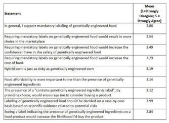 Lusk asked whether “requiring mandatory labels on genetically modified food would increase the confidence I have in the safety of genetically engineered food. On a scale of 1 (strongly disagree) to 5 (strongly agree) a majority of respondents (3.49) said that labels would reassure. And he asked whether “the presence of a ‘contains genetically engineered ingredients label,’ by providing choice, would encourage me to consider buying a product.” A slight majority (3.14) said yes.