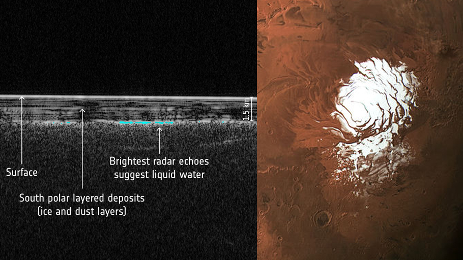 The abstract of the study, published in Science, reads: “The presence of liquid water at the base of the martian polar caps has long been suspected but not observed… Radar profiles collected between May 2012 and December 2015 contain evidence of liquid water trapped below the ice of the South Polar Layered Deposits. Anomalously bright subsurface reflections are evident within a well-defined, 20-kilometer-wide zone centered at 193°E, 81°S, which is surrounded by much less reflective areas. Quantitative analysis of the radar signals shows that this bright feature has high relative dielectric permittivity (>15), matching that of water-bearing materials. We interpret this feature as a stable body of liquid water on Mars.”