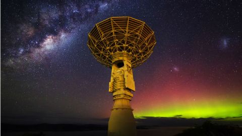 As if staring into the dreamlike scene, the Tasmanian Earth Resources Satellite Station poses in the center, illuminated by nearby city lights. Used to receive data from spacebased Earth observing instruments, including NASA’s MODIS and SeaWiFS, the station was decommissioned in 2011 and dismantled only recently, shortly after the picture was taken on April 30. Still shining in southern skies though, the central bulge of our Milky Way galaxy and two bright satellite galaxies the Large and Small Magellanic Clouds appear in the frame. The Small Magellanic Cloud shines through the fainter red auroral band.