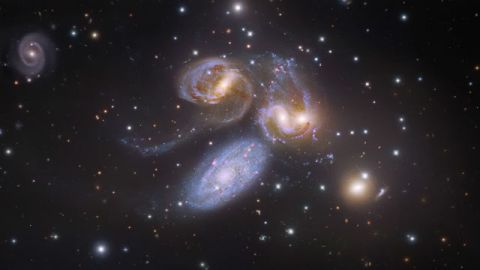 The galaxies of the quintet are gathered near the center of the field, but really only four of the five are locked in a cosmic dance of repeated close encounters taking place some 300 million light-years away. The odd man out is easy to spot, though. The interacting galaxies, NGC 7319, 7318A, 7318B, and 7317 have a more dominant yellowish cast. They also tend to have distorted loops and tails, grown under the influence of disruptive gravitational tides. The mostly bluish galaxy, NGC 7320, is in the foreground about 40 million light-years distant, and isn’t part of the interacting group. Still, captured in this field above and to the left of Stephan’s Quintet is another galaxy, NGC 7320C, that is also 300 million light-years distant. Of course, including it would bring the four interacting galaxies back up to quintet status. Stephan’s Quintet lies within the boundaries of the high flying constellation Pegasus. At the estimated distance of the quintet’s interacting galaxies, this field of view spans over 500,000 light-years.