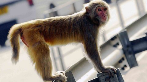 The face of a rhesus macaque monkey, like the ones used in the experiment.