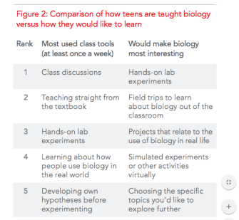 Well, it looks as though there is a pretty big mismatch between the activities that teens find most interesting when it comes to science and the way teaching happens in the classroom. Teens want to do hands-on experiments and take field trips to learn more about how the world works, but the most common teaching activities for science are class discussion and teaching straight out of the textbook. Those in charge of the survey recommend moving toward “inquiry-based STEM curricula,” better training for teachers, and closer ties between schools and local science businesses.