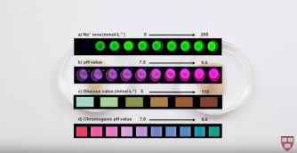 The Dermal Abyss works by swapping out the traditional inks of tattoos with bio-sensing inks. These bio-sensing inks alter color in response the the intestinal fluid. As the picture above shows, the pH sensor changes colors for indicators such as glucose, sodium, and fluoresce. While some color changes could be noticed by the naked eye, other color changes would be seen by using a blue light. The Dermal Abyss was developed as a proof of concept, being made on pigskin. In order for a health-monitoring tattoo to be ready for market, more durable inks that do not fade as quickly would need to be developed.
