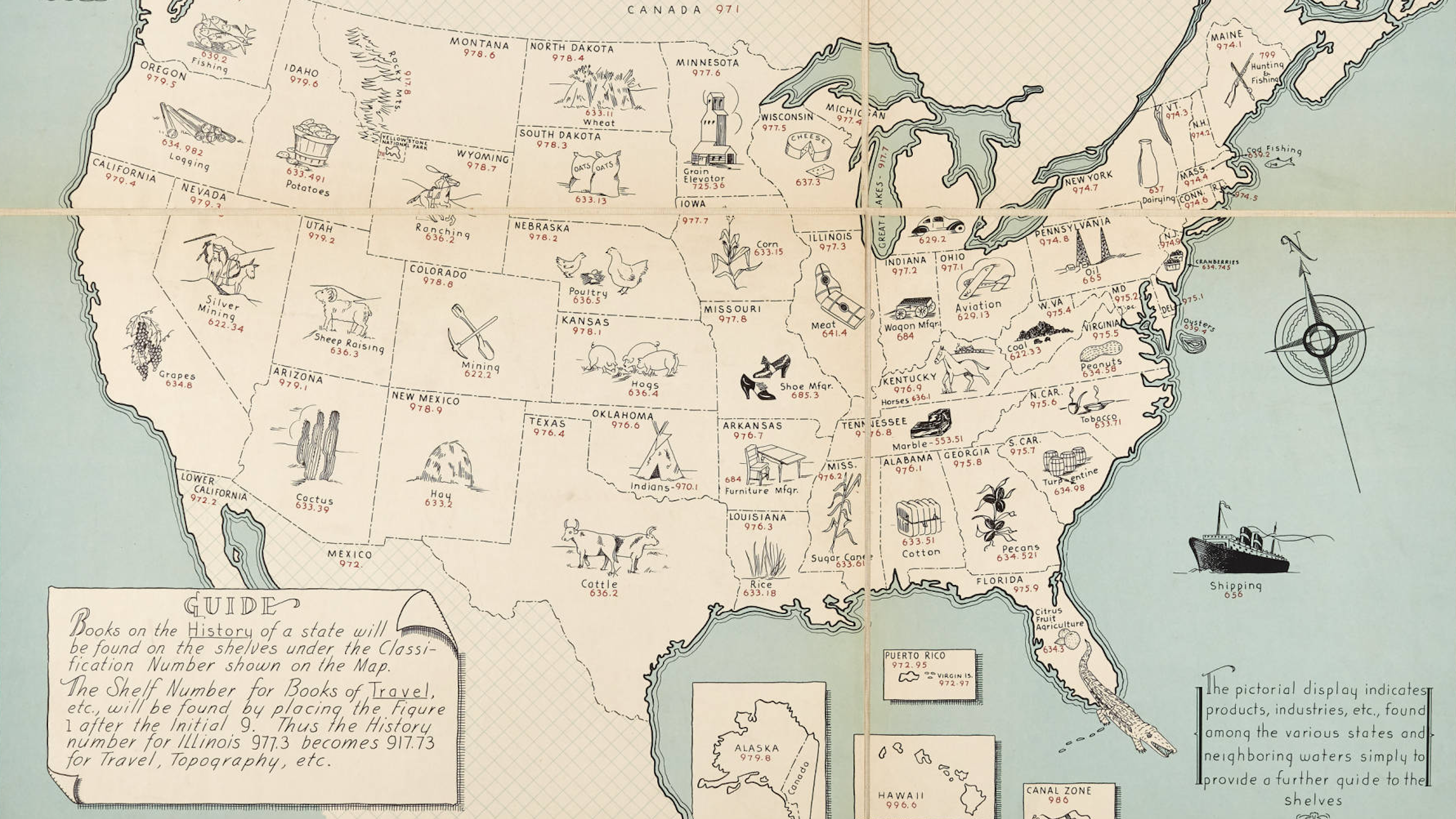This map samples some of the digits that make up the DDC system, invented by the brilliant but flawed Melvil Dewey.