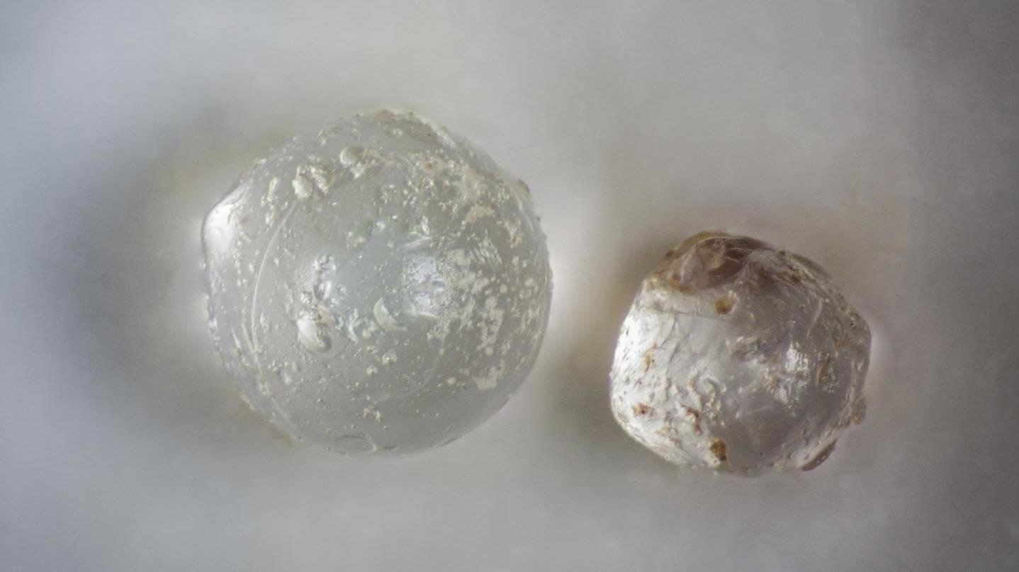 Tiny glassy beads called microtektites were found in fossilized shell remains.