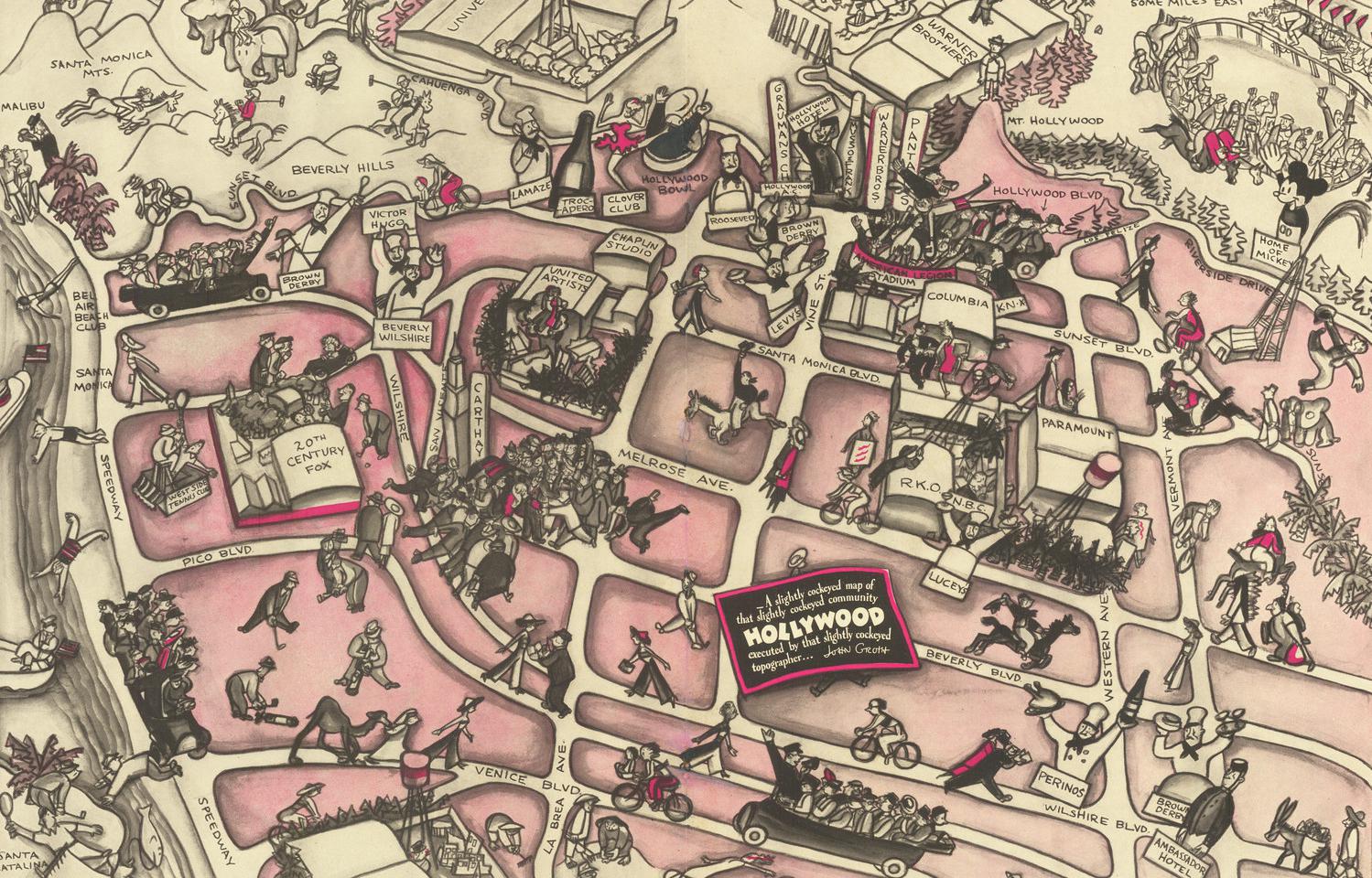 Legendary cartoonist John Groth’s pictorial map captures LA’s film factories in their Golden Age.
