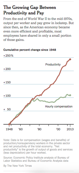 In less than 16 months, when Americans go to the polls to select a new president, one of the central issues will be how to address the stagnant wages of the middle class, people who neither live in abject poverty nor spend their weekends on yachts. This graph from a recent New York Times story shows how dramatically wages are trailing gains in worker productivity: