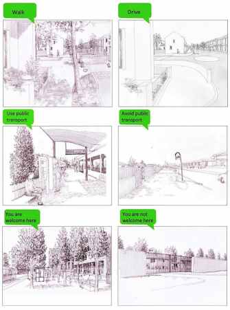These influences might be seen as biases that are figuratively and sometimes literally set in stone. They are the result of design decisions that effectively dedicate spaces to a particular activity (or activities) and deter other activities. The illustrations below show examples of this.