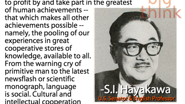 “To be able to read and write is to learn to profit by and take part in the greatest of human achievements — that which makes all other achievements possible — namely, the pooling of our experiences in great cooperative stores of knowledge, available to all. From the warning cry of primitive man to the latest newsflash or scientific monograph, language is social. Cultural and intellectual cooperation is the great principle of human life.” -S.I. Hayakawa, from Language in Thought & Action