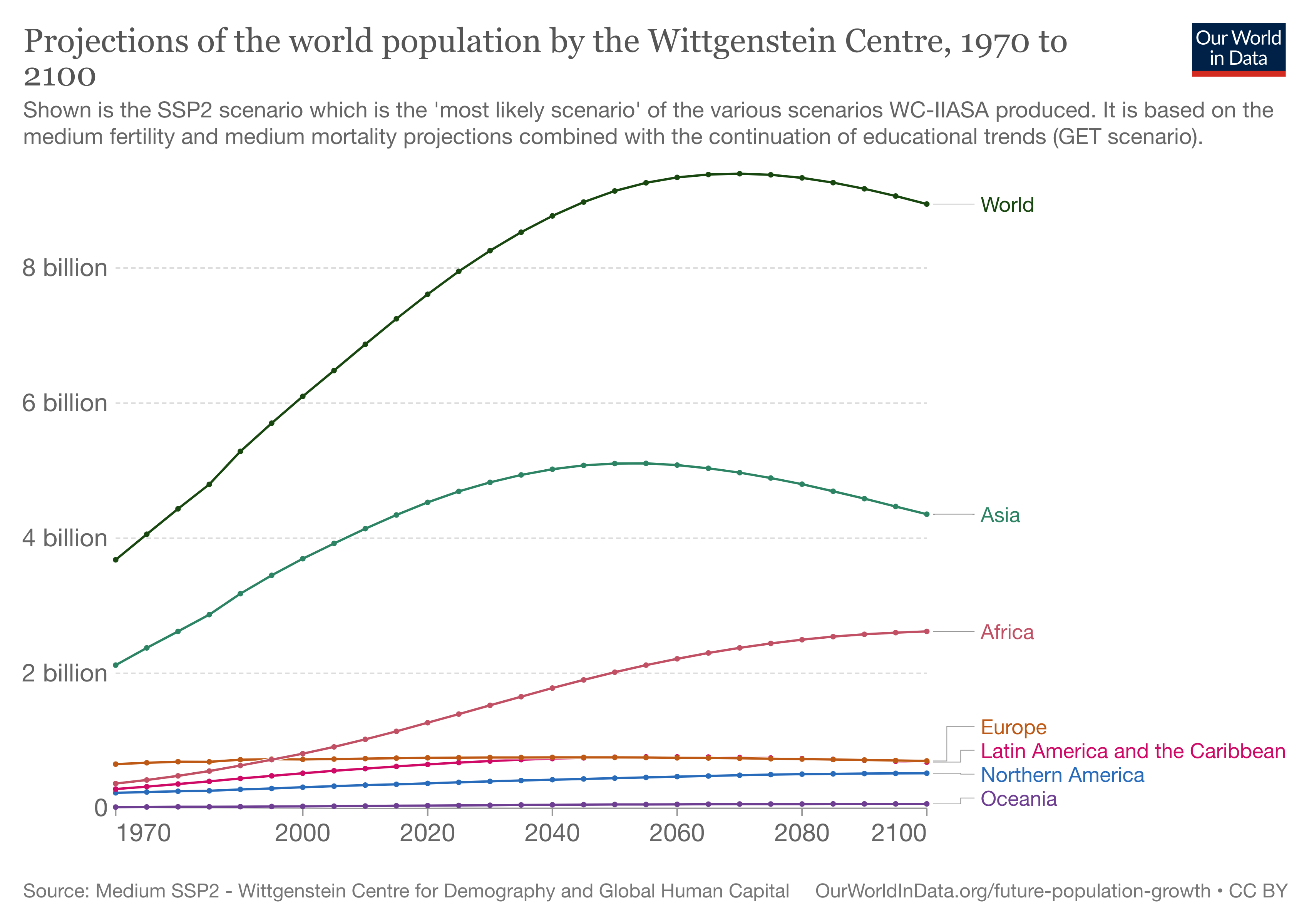 For Asia, this medium scenario by WC-IIASA projects an evolution that is very similar to the UN projection: The population will increase until the mid-21st century when the population plateaus (on a slightly lower level than in the UN projections) and then falls to well below 5 billion until the year 2100.