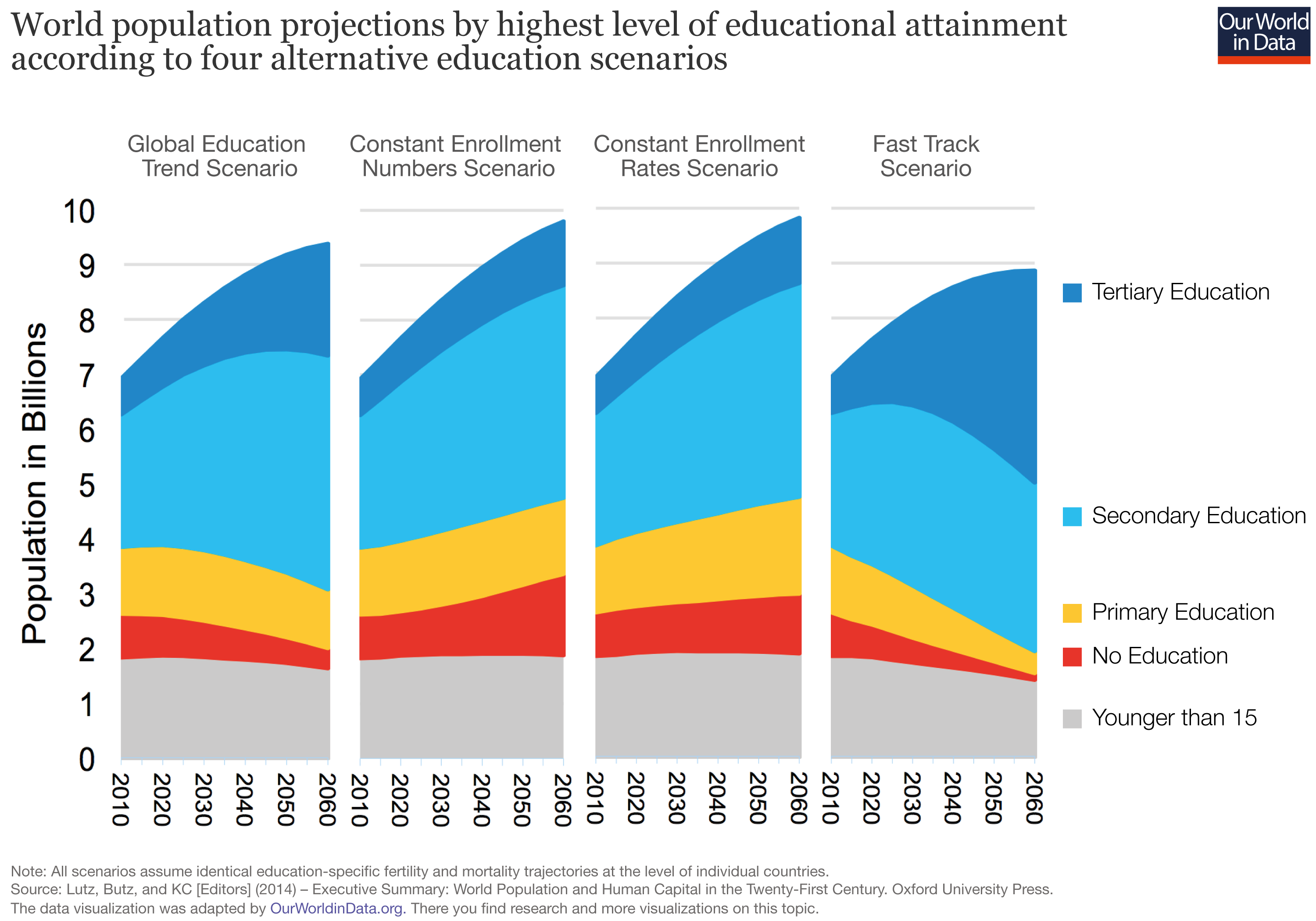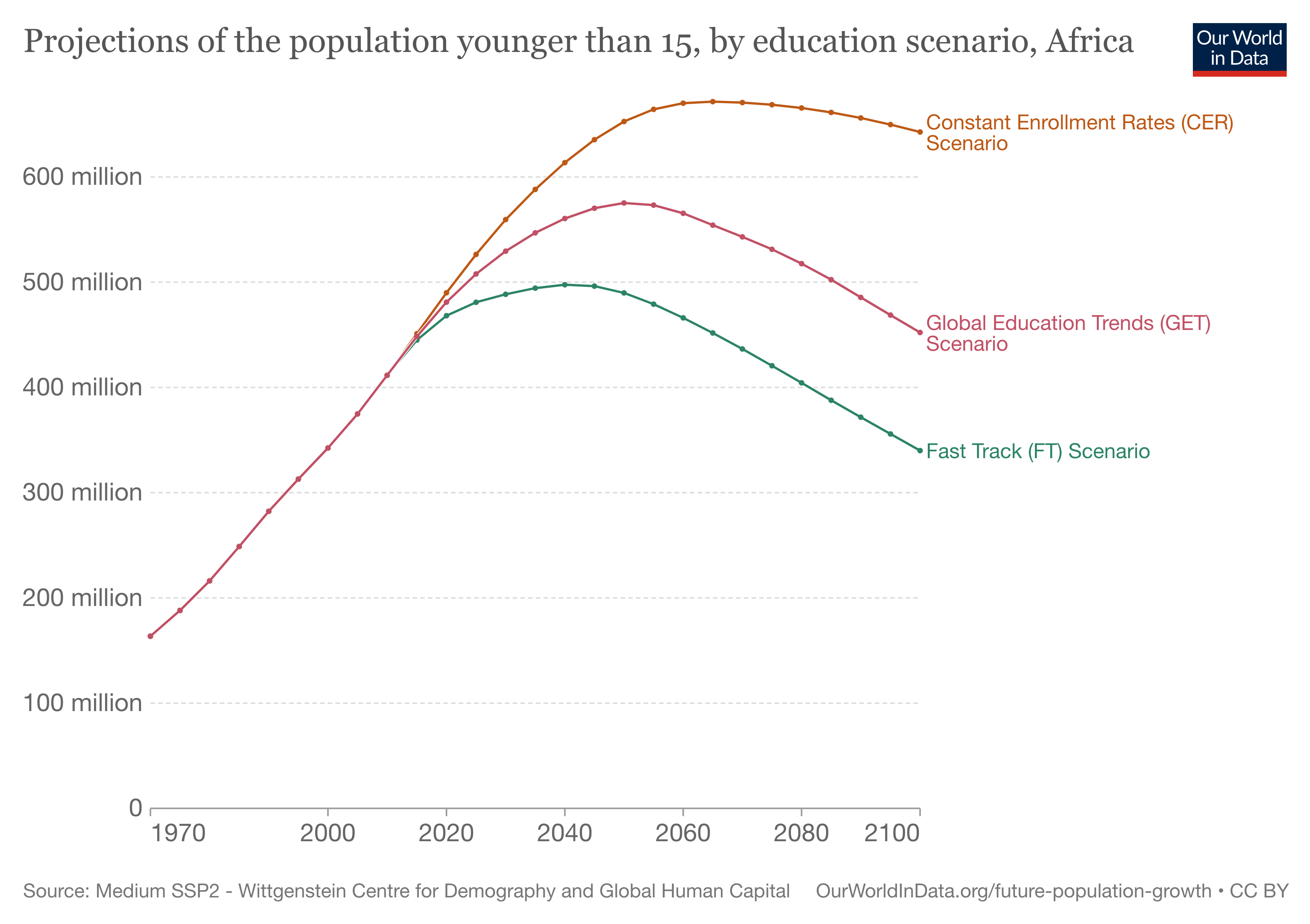- Even faster will be the decline in the Fast Track scenario. If the world can achieve such a rapid expansion of education, then the size of the population of under-15-year-olds is projected to fall and decline to just one billion in 2100 (almost the same level as 1950).